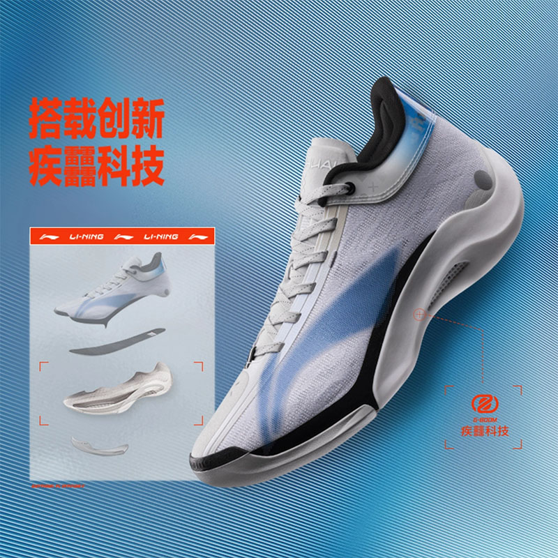 Li-Ning YuShuai 20th G-Boom Basketball Shoes in White/Black/Blue are configured with the latest technology: G-BOOM The Polymer Core Drive System is a new midsole composite technology developed for professional sports.